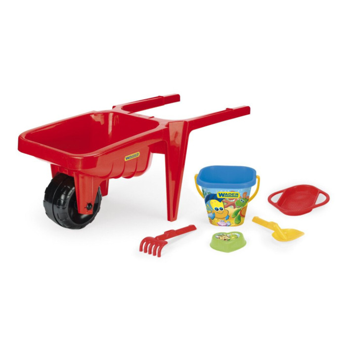 велика тачка довжиною 77 см міцна конструкція, загальною вантажопідйомністю до 100 кг набір до піску – відеречко, формочка, ситечко, грабельки, лопатка придатний для гри як в домі так і на вулиці виготовлений з високоякісних матеріалів, стійких до погодних умов для дітей від 1 року