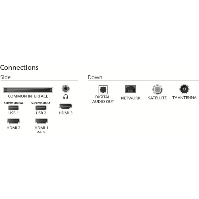Інтерфейси підключення включають 3 x HDMI, 2 x USB, CI, RJ-45, антенний вхід та оптичний аудіо вихід, що забезпечує широкий спектр підключень та інтеграцій. Завдяки цифровим тунерам DVB-C та DVB-T2, ви отримуєте доступ до безлічі телеканалів з високою якістю сигналу.