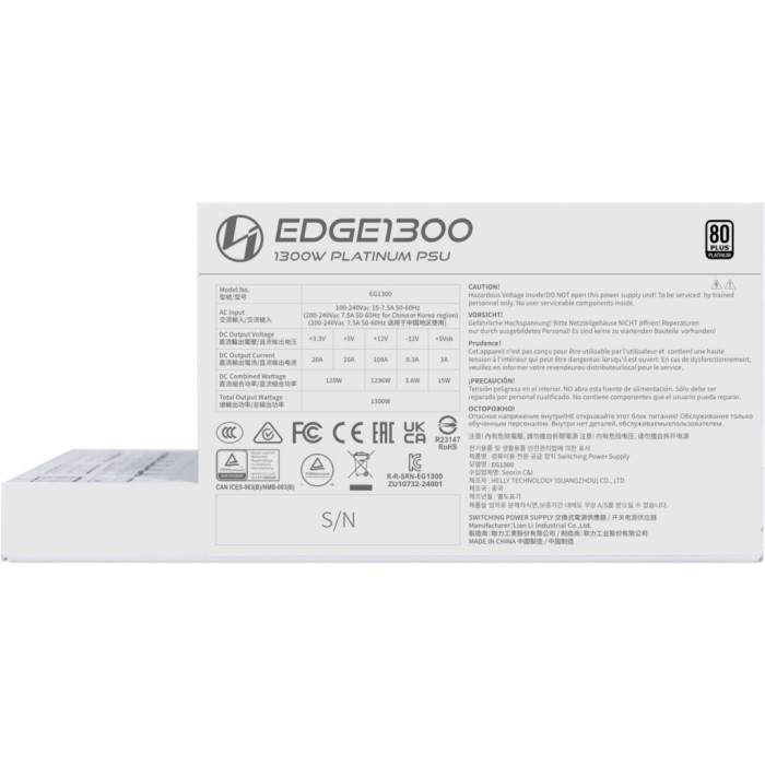 Блок живлення Lian Li 1300W EDGE1300 White – це не просто надійне джерело енергії для вашого комп'ютера. Це продукт, що уособлює собою якість, інновації та стиль, поєднуючи їх в одному рішенні. Завдяки своїм унікальним характеристикам і високому рівню надійності цей блок живлення стане ідеальним вибором для створення потужної та енергоефективної системи, яка буде готова справлятися з будь-якими завданнями. Оберіть Lian Li EDGE1300 для безкомпромісного й ефективного живлення вашого ПК і відчуйте переваги на власному досвіді.