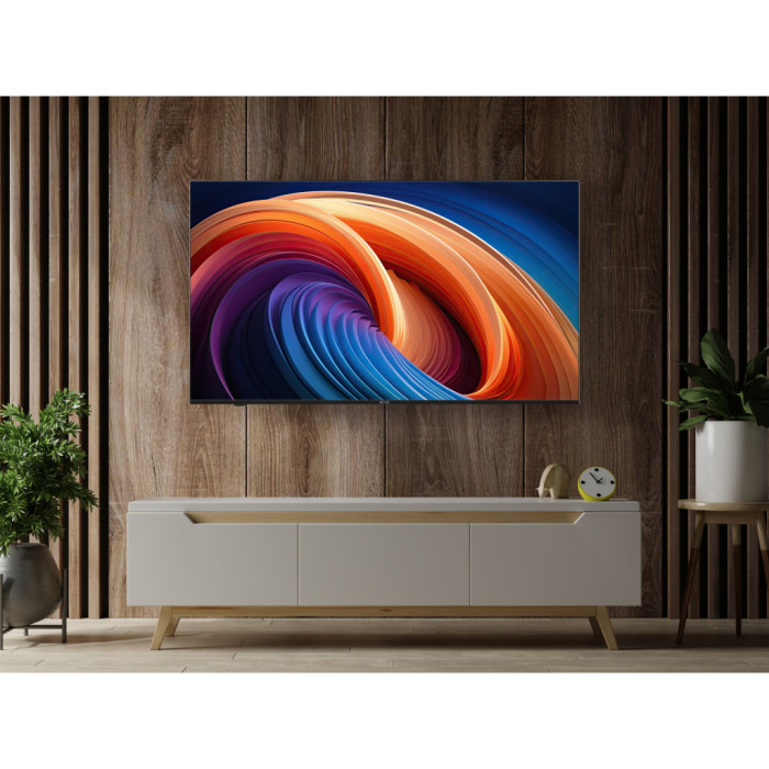 Дизайн телевізора також заслуговує на увагу – безрамковий екран підкреслює його сучасність і дозволяє повністю зосередитися на перегляді. Установка можлива на комплектну підставку або за допомогою стандартного кріплення VESA 400x300, яке забезпечує максимальну гнучкість в розташуванні.