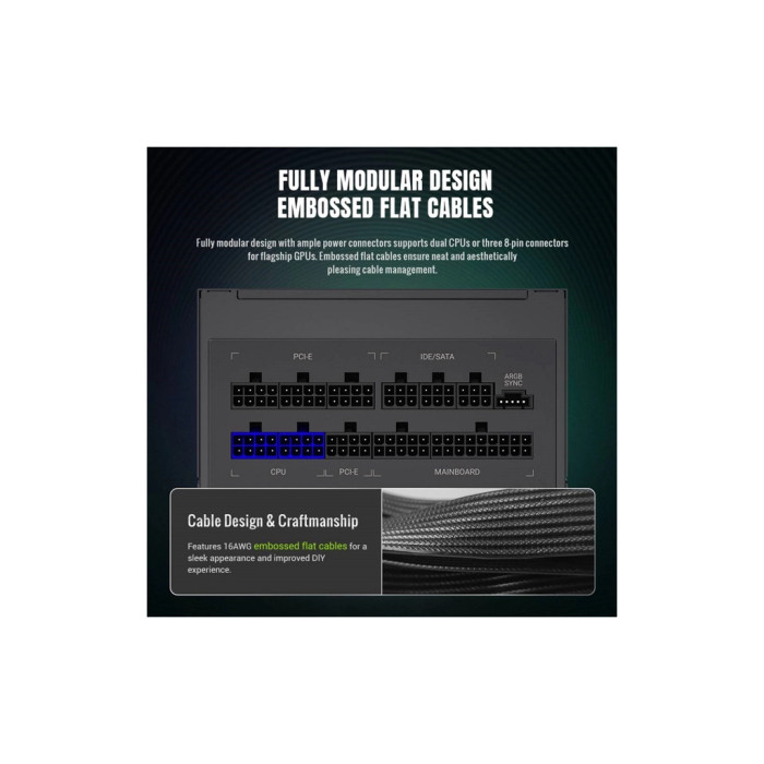 Цей блок живлення оснащений активним модулем PFC, що додатково підвищує енергетичну ефективність і знижує споживання електроенергії. Semi-модульне підключення кабелів дозволяє максимально скоротити кількість зайвих дротів, надаючи вам можливість використовувати лише необхідні. Це підвищує естетичну привабливість інтер'єру вашого комп'ютера.