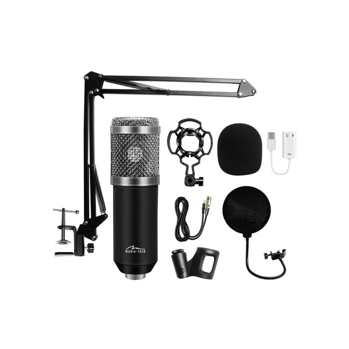 Ігровий стрім мікрофон Media-Tech професійний набір XLR - це набір для потокового і студійного запису звуку. Він включає в себе конденсаторний мікрофон, регульовану настільну підставку, поп-фільтр, антивібраційний кошик, губчастий обтічник, зовнішню звукову карту та проводку. Поп-фільтр на гнучкій штанзі понижує звукові перешкоди від дихання людини – ваші записи будуть чистішими та приємнішими на слух. Дію поп-фільтра посилює губка обтічника – вона зменшує небажані пориви повітря, чим підвищує якість звукозапису.