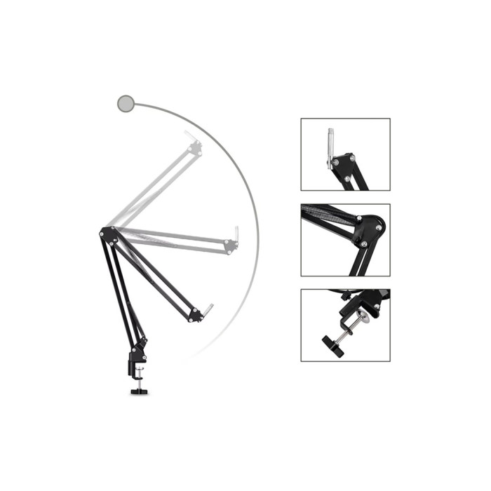 Антивібраційний кошик запобігатиме передачі різноманітних сторонніх вібрацій через мікрофонну стійку на звукову доріжку. Регульована настільна підставка, яка кріпиться на стільниці, забезпечує надійну фіксацію мікрофона та дозволяє зменшити сторонні вібрації. Її можна використовувати та з іншими мікрофонами.