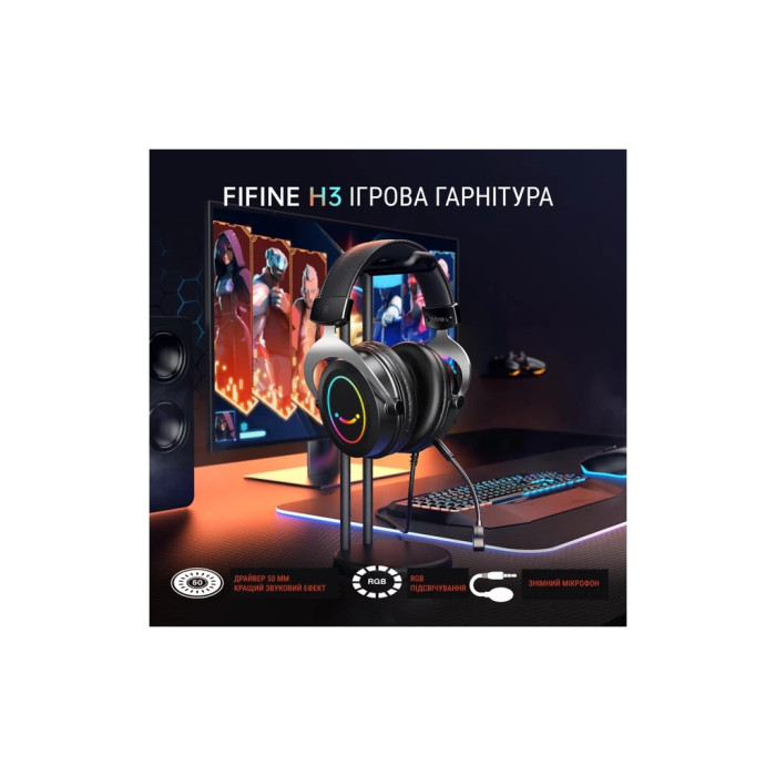 Навушники Fifine H3 RGB Black (H3) — це ідеальне рішення для геймерів, які прагнуть зберегти баланс між якістю звуку та комфортом. Ці геймерські навушники створені, щоб перенести вас у серце будь-якої гри завдяки посиленим низьким частотам, які додають потужного резонансу кожному вибуху та сліду ворога.