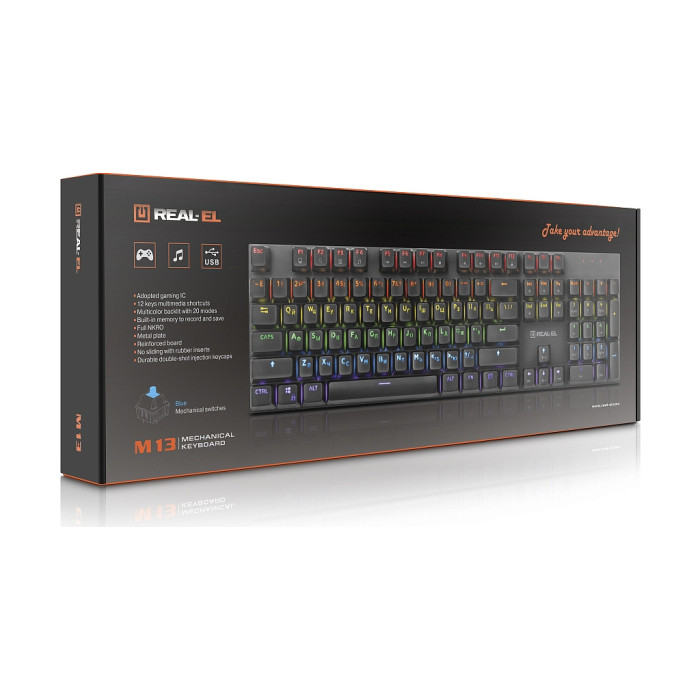 Завдяки провідному підключенню через USB-інтерфейс, клавіатура стабільно працює без затримок, забезпечуючи плавну та надійну взаємодію з комп'ютером. Повнорозмірний формат дозволяє забезпечити легкий доступ до всіх необхідних клавіш. Незалежно від того, чи ви граєте в онлайн-шутер, чи взаємодієте з друкованим текстом, клавіатура REAL-EL M 13 Grey задовольнить ваші потреби завдяки багатофункціональній RGB підсвітці клавіш.