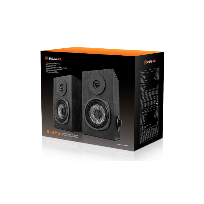 REAL-EL S-225 отримує живлення через USB-порт, що робить її надзвичайно зручною для використання з комп'ютером або ноутбуком. Просто під'єднайте систему до ПК через вмонтований USB-кабель живлення, і насолоджуйтеся музикою без потреби в додаткових адаптерах чи батарейках.