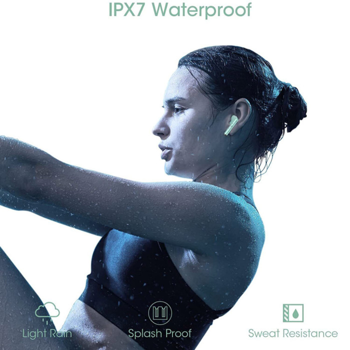 Дизайн навушників забезпечує максимальний комфорт під час носіння. Легкі та зручні вкладиші виготовлені з якісного пластику, що дозволяє не відчувати тиск на вуха навіть після тривалого використання. Стандарт захисту IPX7 робить ці навушники стійкими до вологи та пилу, що особливо актуально для активного способу життя — ви можете продовжувати слухати музику навіть під час дощу або під час занять спортом.