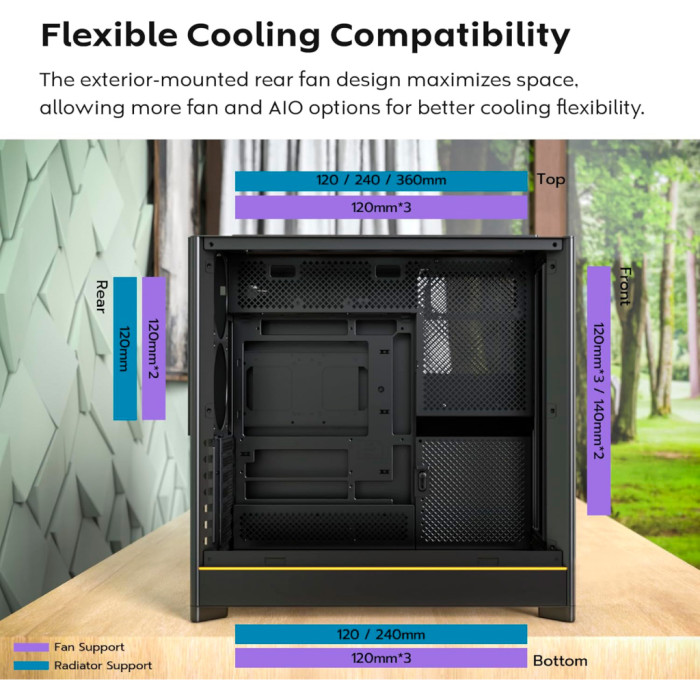 Однією з унікальних особливостей корпусу MONTECH HS01 є його інноваційні рішення для охолодження. Завдяки реалізації концепції "димохід", тепле повітря вільно циркулює знизу вгору, максимізуючи ефективність тепловідведення. Додаткові місця для вентиляторів на передній, нижній і задній панелях разом із підтримкою рідинного охолодження різних форм-факторів гарантують, що навіть найпотужніші конфігурації залишатимуться охолодженими. Ви можете встановити CPU кулери до висоти 175 мм і розмістити відеокарти до 420 мм завдовжки.