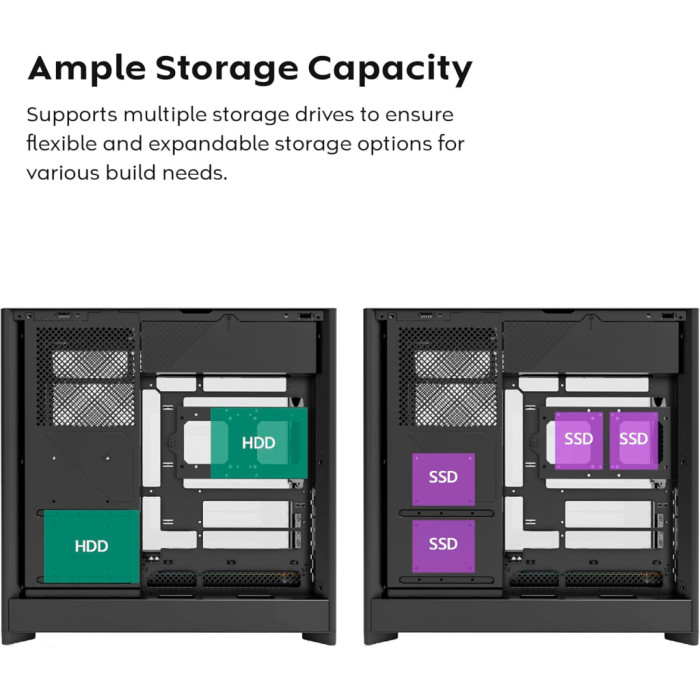 Однією з найбільших переваг даної моделі є підтримка материнських плат різного розміру — від компактних Mini-ITX до повнорозмірних ATX і Micro-ATX, що надає широкі можливості для налаштування і персоналізації вашої системи. Безкомпромісна гнучкість в компонуванні забезпечується внутрішніми відсіками: два для 3.5-дюймових жорстких дисків та чотири для 2.5-дюймових накопичувачів, що дозволяє легко адаптувати систему під ваші потреби зберігання даних.
