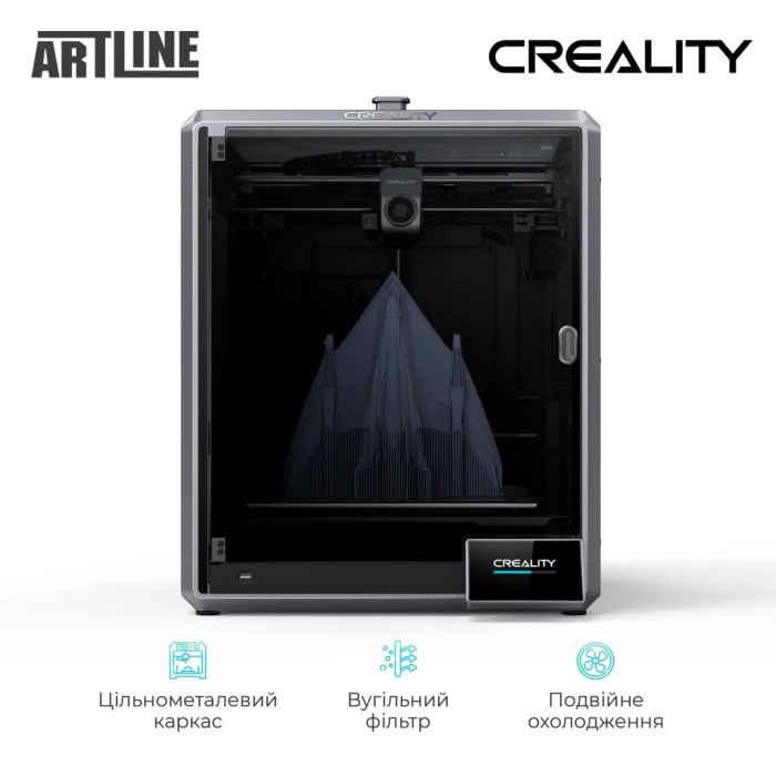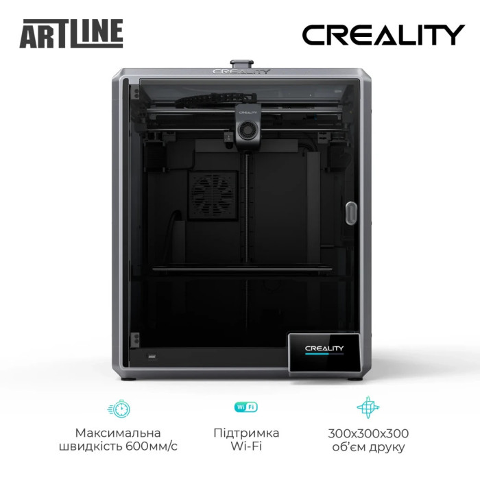 Завдяки закритій конструкції та області побудови 300х300х300 мм, принтер забезпечує стабільну температуру всередині камери, що сприяє якості друку. Автоматичне вирівнювання робочої поверхні, функція відновлення друку після збою та датчик закінчення філаменту роблять процес друку максимально зручним і безперервним.