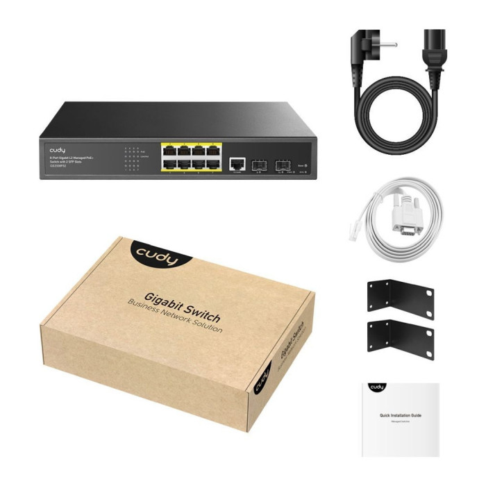 Комутатор мережевий Cudy GS2008PS2 — це сучасний керований пристрій 2-го рівня, відзначений високоякісними характеристиками та металевим корпусом, що гарантує довговічність і надійність. Головною перевагою є наявність 11 портів, з яких 8 — це PoE-порти, що підтримують передачу даних на швидкості 10/100/1000 Mbps, два SFP-порти для гігабітних підключень та один консольний RJ45-порт для зручного управління. Комутатор відзначається підтримкою стандартів живлення PoE IEEE802.3af/at, забезпечуючи потужність до 30 Вт на один канал та загальну потужність у 120 Вт.