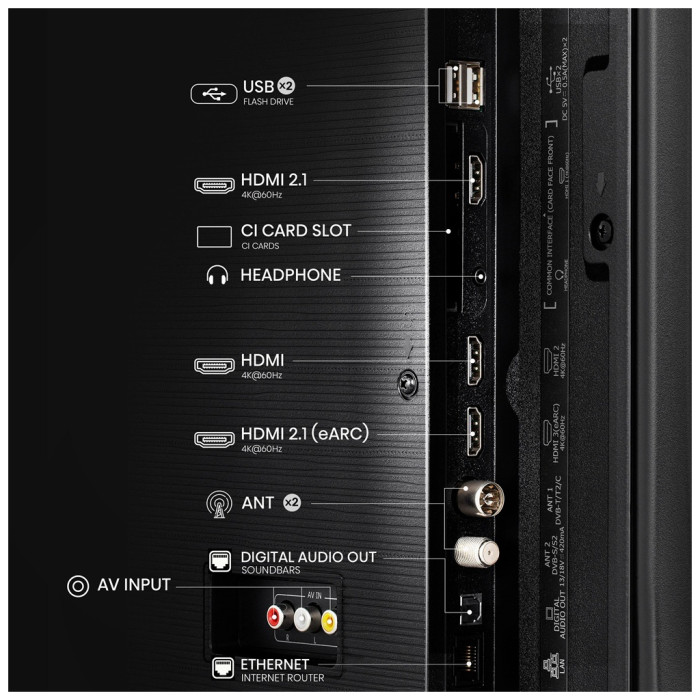 HDR10, Game bar, Filmmaker Mode, AI Picture, VRR, Dolby Vision HDR, ALLM, DTS Virtual:X, AI Sports Mode, AI 4K Upscaler, HDR Upscaler, AI Smooth Motion, Game Mode Plus, AI Light Sensor