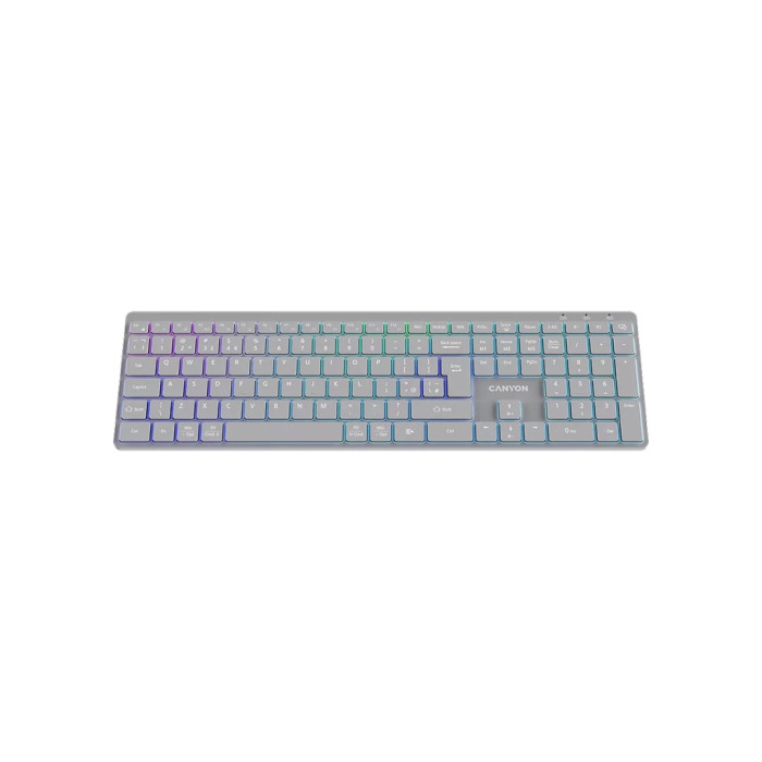 Клавіатура Canyon HKB-W11 Slim Dual Mode Wireless/Bluetooth RGB UA Grey (CNS-HBTK11G) – це ідеальний симбіоз сучасних технологій і відмінного комфорту, створена для тих, хто цінує ефективність і стиль. Її витончений, елегантний дизайн відразу привертає увагу, роблячи її оптимальним вибором для домашнього робочого місця, офісу або активних подорожей.