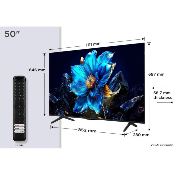 Дизайн TCL 50P7K безрамковий із тонким металевим корпусом, що надає йому сучасного вигляду, який гармонійно вписується у будь-який інтер'єр, перетворюючи ваш простір на унікальний арт-простір. Гнучкі можливості монтажу дозволяють розмістити телевізор як на підставці, так і на стіні, згідно зі стандартом VESA (300x300 мм).