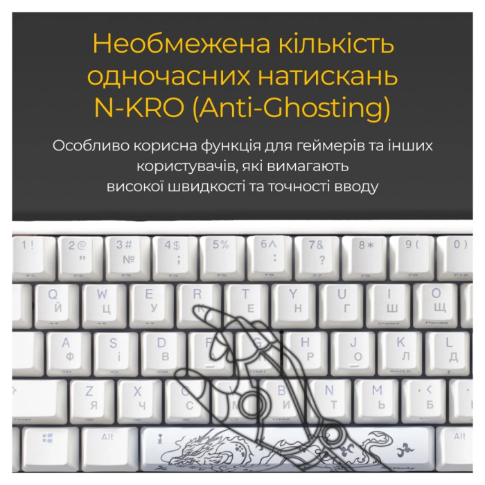 Клавіатура оснащена NKRO технологією (No Key Rollover), завданням якої є бездоганне розпізнавання кількох натискань одночасно. Це важливо для геймерів та професіоналів, які цінують швидкість та точність.