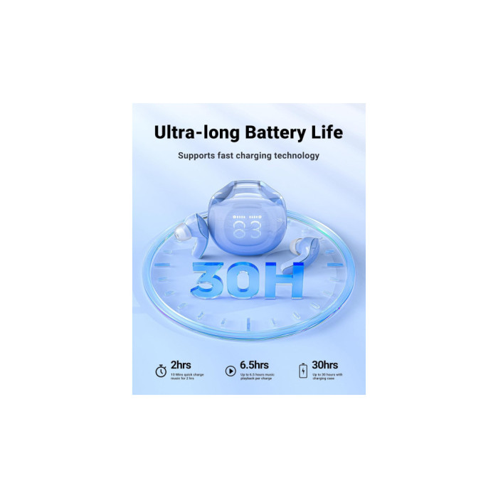 Беззаперечна перевага цих навушників – тривалий час роботи від акумулятора. Одного заряду вистачає на 6.5 години безперервного прослуховування музики, а разом із зарядним футляром, що має ємність 480 мАг, ви отримуєте до 30 годин звукового задоволення без потреби у підзарядці. Навіть якщо у вас насичений день, швидке 10-хвилинне заряджання через USB Type-C подарує додаткові дві години роботи, які можуть стати вирішальними.