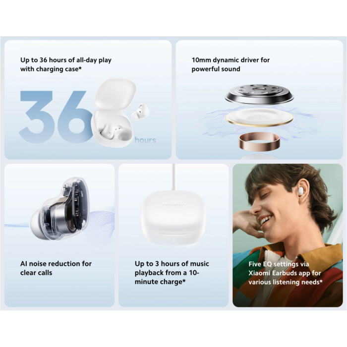 Модель оснащена потужними 10-мм динаміками, які відтворюють глибокі баси і чіткі високі частоти для максимального задоволення від прослуховування. Підтримка 2.0 звукової системи забезпечує повний спектр звучання, щоб жодна деталь вашого улюбленого трека не залишилася непоміченою. Особлива увага приділена функції шумоподавлення AI ENC, яка фільтрує фоновий шум, дозволяючи безпечно і ясно передавати звук при розмовах.