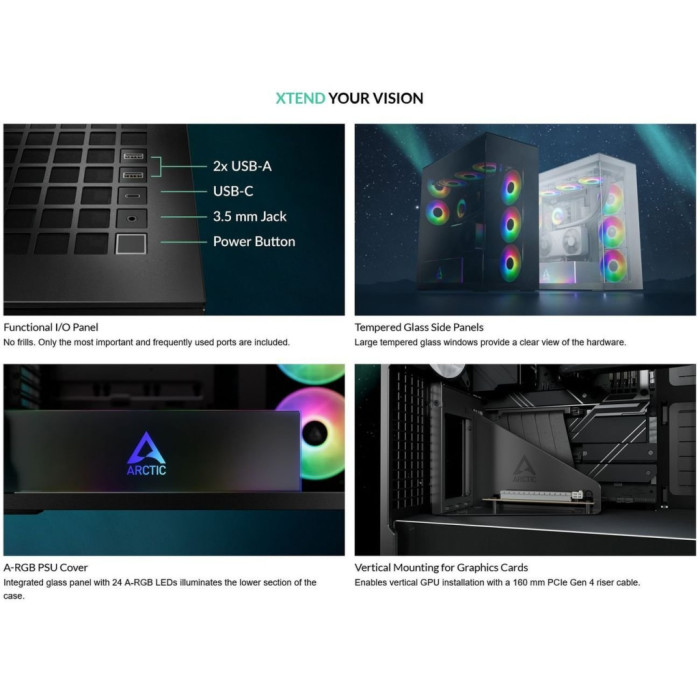 Сучасний, практичний та надійний — Arctic XTENDERVG W відповідає найвищим вимогам комп'ютерних ентузіастів, надаючи їм можливість створити систему, що виділяється не лише зовні, а й зсередини. Це ідеальне рішення для тих, хто шукає баланс між технологічними інноваціями, дизайном та продуктивністю.
