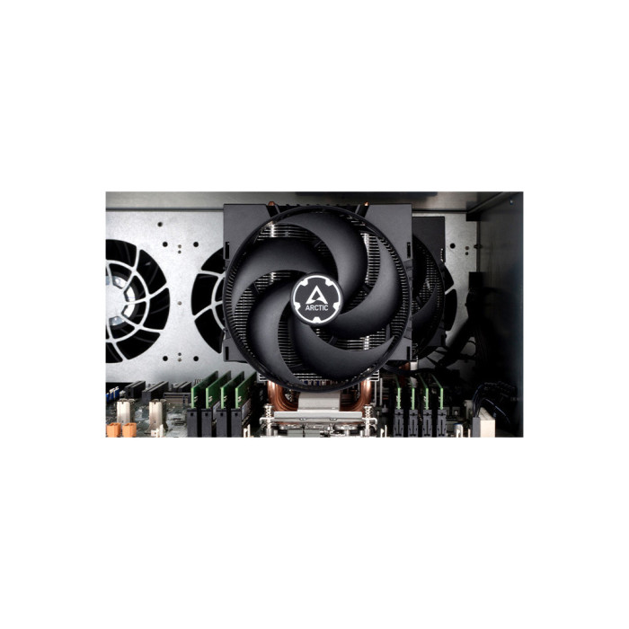 Компактний дизайн і сумісність із двома сокетамиОптимальна висота встановлення становить усього 145 мм, тому він підходить як для класичних серверних стійок 4U, так і для більшості споживчих корпусів 4U, доступних на ринку. Freezer 4U має компактний дизайн із розмірами всього 156 x 124 мм. Це також дає змогу використовувати його для двосокетних материнських плат. Щоб змінити напрямок повітряного потоку, вентилятори можна легко поміняти місцями.