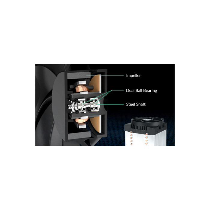 Призначений для безперервної роботиОбидва вентилятори Freezer 4U-M обладнані подвійними шарикопідшипниками, що дає змогу забезпечити безперервну роботу в режимі 24/7 без найменшого збитку для продуктивності. Цей тип підшипників набагато стійкіший до забруднення і зносу під впливом високих температур, ніж звичайні підшипники ковзання або гідродинамічні підшипники, і тому є ідеальним вибором, якщо ви хочете забезпечити безвідмовну безперервну роботу.