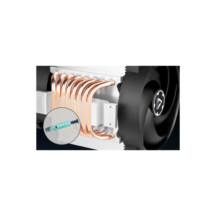 Термопаста преміум-класу в комплектіДо комплекту постачання Freezer 4U-M входить термопаста MX-6. Термопаста Arctic Ultimate Performance зменшує накопичення тепла між теплорозподілювачем процесора і кулером. Термопаста не є ні провідною, ні ємнісною, а тому абсолютно безпечна у використанні.