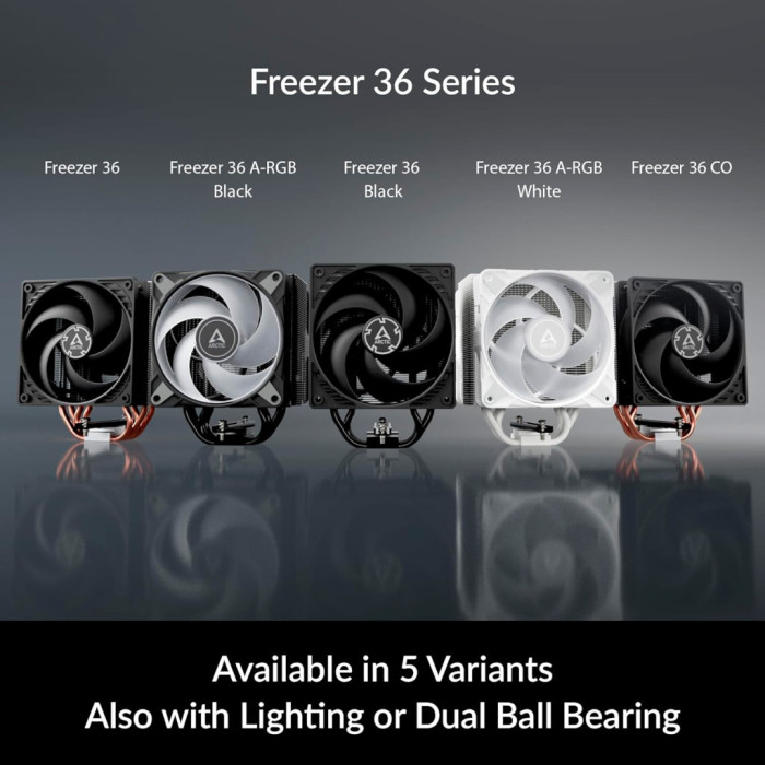 Великий вибір варіантівFreezer 36 доступний у п'яти різних версіях, кожна з яких оснащена двома вентиляторами в конфігурації push-pull. Крім стандартної моделі з алюмінієвим радіатором, доступна також версія з чорним радіатором. Для безперервної роботи існує також версія CO, оснащена вентиляторами з подвійними шарикопідшипниками. Крім того, користувачі можуть вибрати між чорною і білою версією з вентиляторами ARGB.