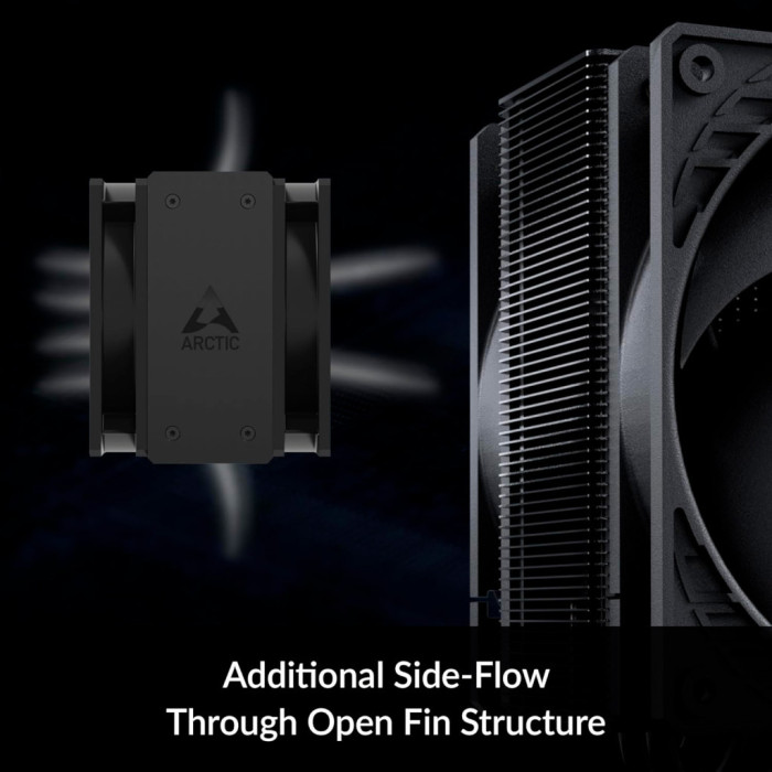 Оптимізований радіаторРебра радіатора відкриті збоку і дають змогу витяжному вентилятору витягати додаткове холодне повітря з корпусу ПК через радіатор. Така конструкція бічного потоку забезпечує ще ефективнішу вентиляцію.