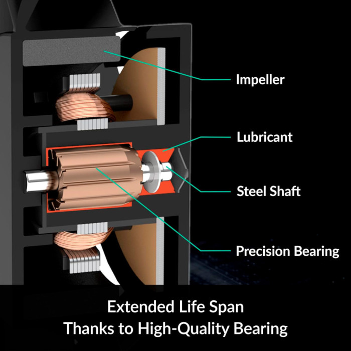 Високоякісний підшипникЗавдяки комбінації сплаву і мастила, розробленої в Німеччині, тертя в підшипнику зводиться до мінімуму і досягається велика ефективність. Крім запобігання втрати мастила, знос пальця і втулки також зводиться до мінімуму. Таким чином, виділяється менше тепла, знижується шум від підшипника і значно збільшується термін служби вентилятора.