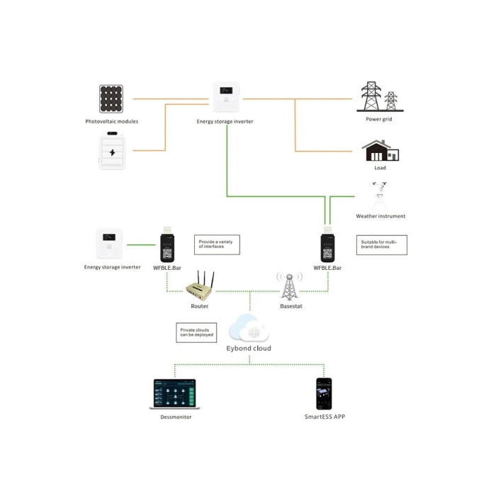 Модуль Wi-Fi Kit забезпечує бездротовий зв'язок між автономними інверторами та платформами моніторингу. Користувачі мають можливість віддаленого моніторингу та керування інверторами при використанні модуля Wi-Fi з додатком Smart ESS для Android|iOS або через веб-сервіс з ПК/ноутбук.