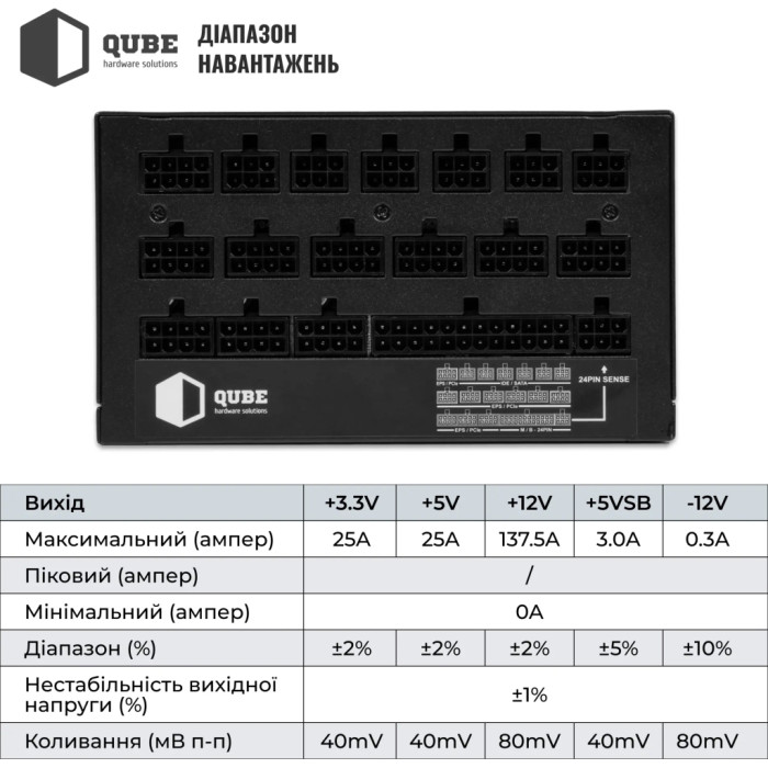 Блок живлення Qube 1650W (QBF-HP1-1650GD-14C) - це першокласне рішення для користувачів, які цінують якість, надійність та продуктивність своєї комп'ютерної системи. З потужністю в 1650 Вт, цей блок живлення забезпечує стабільну роботу навіть для найбільш вимогливих конфігурацій, включаючи сучасні багатоядерні процесори та високопродуктивні відеокарти. Його стандарт ATX розрахований на універсальну сумісність з більшістю корпусів, що значно спрощує процес інтеграції в існуючу систему.