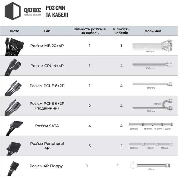 З компактними розмірами, всього 190 x 150 x 86 мм, цей блок живлення легко встановлюється у більшість стандартних корпусів, залишаючи достатньо простору для інших компонентів та кабелів. Таким чином, блок живлення Qube 1650W (QBF-HP1-1650GD-14C) поєднує в собі всі необхідні характеристики для оптимальної роботи вашої системи, задовольняючи потреби найвибагливіших користувачів. Це вибір тих, хто прагне максимальної продуктивності та безпеки, не жертвуючи енергоефективністю.