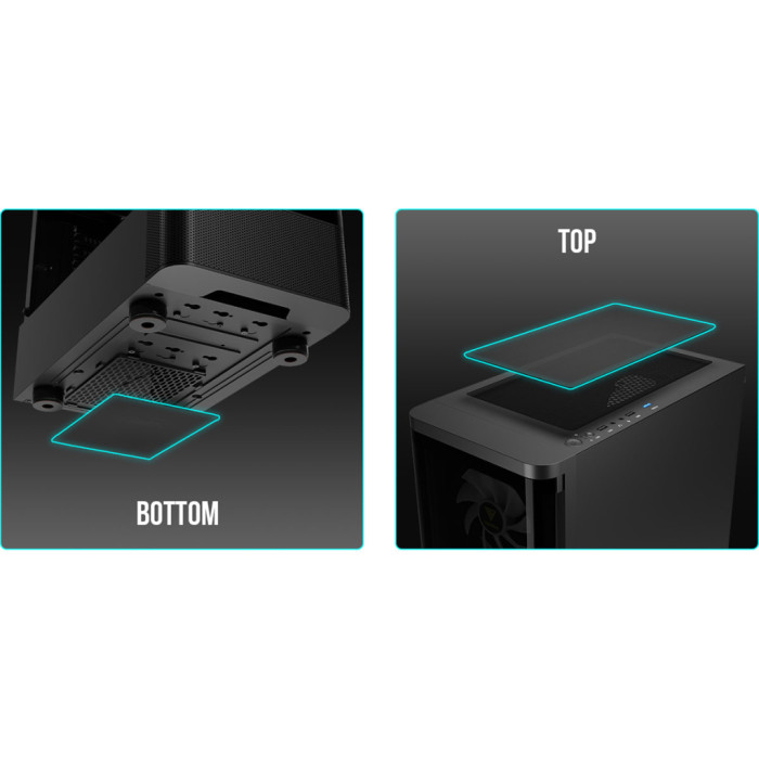 Ергономічний дизайн доповнений передньою панеллю з усіма необхідними роз'ємами. В ній розміщені 2 портів USB 2.0, 1 порт USB 3.0 та аудіороз'єми, забезпечуючи легкий доступ до підключення зовнішніх пристроїв. Додатково, корпус має ефективні пилові фільтри, що захистять ваші компоненти від негативного впливу пилу, підтримуючи чистоту всередині та продовжуючи термін їх служби.