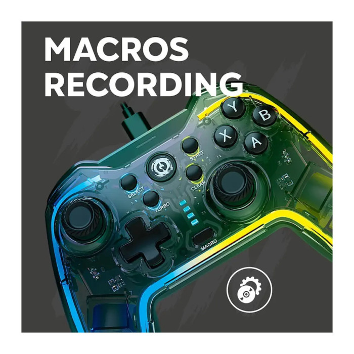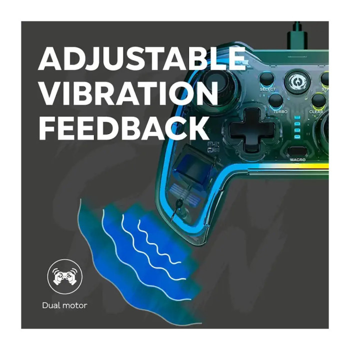 Ready player one! Підготуйтеся до гри з новим геймпадом Canyon Brighter GP-02. Він створений для забезпечення максимального зчеплення та максимального комфорту, гарантуючи, що ви зможете по-справжньому насолодитися ігровими сеансами. Модель Canyon Brighter із кришталево прозорим корпусом виправдовує свою назву. У поєднанні з RGB-підсвічуванням це має дивовижний вигляд! Пристрій підтримує режими X-входу та D-входу та має дванадцять програмованих кнопок, що дозволяють налаштовувати та покращувати ігровий процес. Ми також додали двигуни з подвійною вібрацією для правильного тактильного зворотного зв'язку.