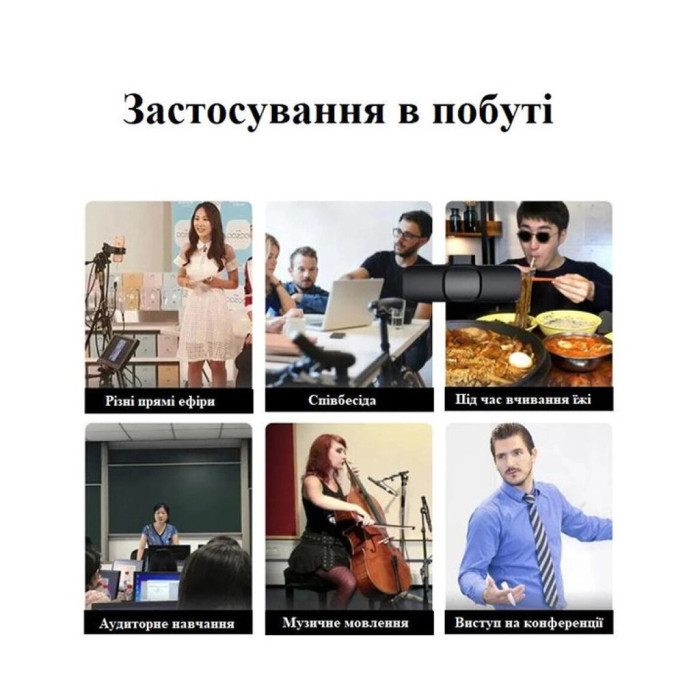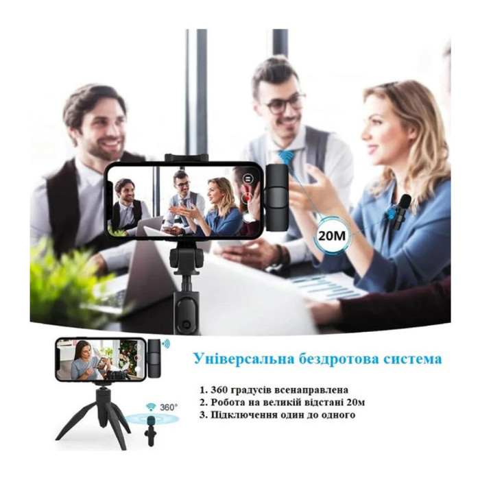 Дана система радіо мікрофона складається з приймача (ресивера), що підключається до смартфону і мікрофона петлички з передавачем, що закріплюється на одязі. Дальність зв'язку по радіоканалу становить до 20 метрів при прямій видимості, тому ви зможете використовувати цей радіомікрофон як у приміщенні, так і на вулиці; Щоб розпочати запис, його достатньо підключити до телефону;Поролоновий захист від вітру – значно покращує якість звукозапису як у домашніх, так і у вуличних умовах. Якщо через вашу діяльність мікрофон використовується на відкритому повітрі, то захист від вітру забезпечить необхідну ізоляцію від зайвих шумів, спричинених вітром. За його допомогою ви зменшите шум вітру, зберігаючи при цьому акустичну прозорість звучання;Індикатор мікрофона;Прищіпка кліпса тримач (тип – крокодил);Кнопка увімкнення/вимкнення;Порт заряджання мікрофона.Інструкція з використання ресивера: Щоб увімкнути, потрібно вставити ресивер у телефон – блимає індикатор;З'єднавшись із мікрофоном – індикатор постійно світиться;Щоб вимкнути ресивер, потрібно від'єднати його від телефону;Для прослуховування відео зі звуком необхідно вийняти телефон з телефону.Інструкція з використання мікрофону: Щоб увімкнути мікрофон, натисніть кнопку – блимає індикатор;З'єднавшись із ресивером – індикатор буде постійно світитися;Натиснувши кнопку перемикання ще 1 раз - індикатор блимає повільно і означає, що мікрофон у режимі Паузи; Якщо низький заряд акумулятора – блимає червоний індикатор кожні 10 с;Щоб зарядити мікрофон, підключіть кабель заряджання до USB – червоний колір згасне, коли батарея повністю заряджена.