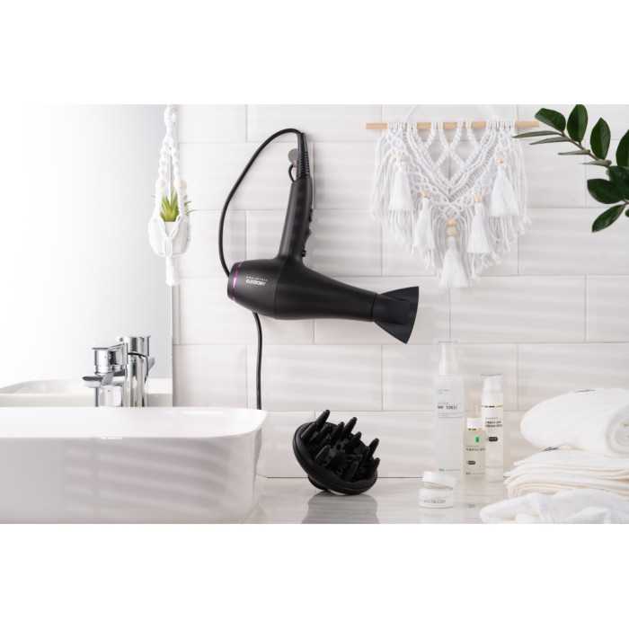 Особливим плюсом є функція подачі холодного повітря, що закріплює зачіску і додає їй блиску, підкреслюючи кожну деталь вашого стилю. Додатковий захист від перегріву гарантує довгий термін служби пристрою, а петля для підвішування дозволяє охайно зберігати фен, економлячи простір у ванній кімнаті або салоні.