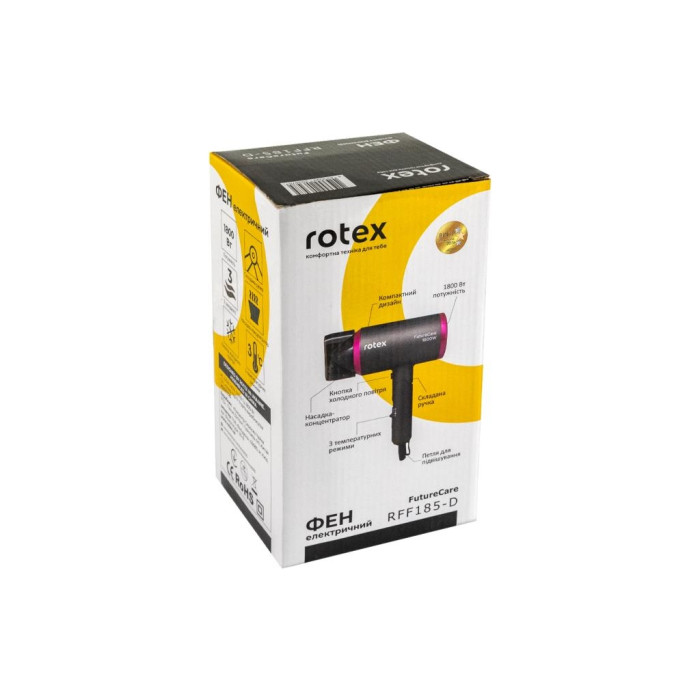Якщо ви у пошуку надійного та стильного фена, який не лише буде ефективно виконувати свої функції, а й вдало доповнить ваш образ, Rotex RFF185-D FutureCare — це ваш ідеальний вибір. Його доступна ціна робить його ще привабливішим варіантом за якісними характеристиками серед інших моделей, які також шукають ті, хто прагне знайти ідеальний баланс між ціною і якістю. Він стане вашим незамінним компаньйоном вдома та в дорозі, даруючи при цьому комфорт та незмінну якість кожного дня.