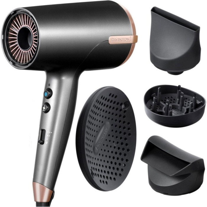 Унікальність цього пристрою підкреслюється низкою додаткових функцій та насадок. Фен оснащений іонізацією з генератором іонів, яка забезпечує до 80 мільйонів іонів під час кожного використання, надаючи вашому волоссю гладкість і шовковистість та запобігаючи ефекту статичної електрики. З технологією захисту від перегріву та датчиком Thermacare, фен постійно контролює температуру повітря, захищаючи волосся від термічного ушкодження без шкоди для якості укладки.