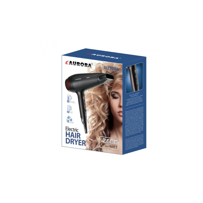 Фен виконано в елегантному чорному кольорі, який гармонійно впишеться в будь-який інтер'єр. Aurora AU3203 – це поєднання відмінної якості, зручності та доступності, що робить його оптимальним вибором для тих, хто шукає потужний та недорогий фен. Вибираючи цей прилад, ви обираєте надійного помічника для створення стильних образів кожного дня.
