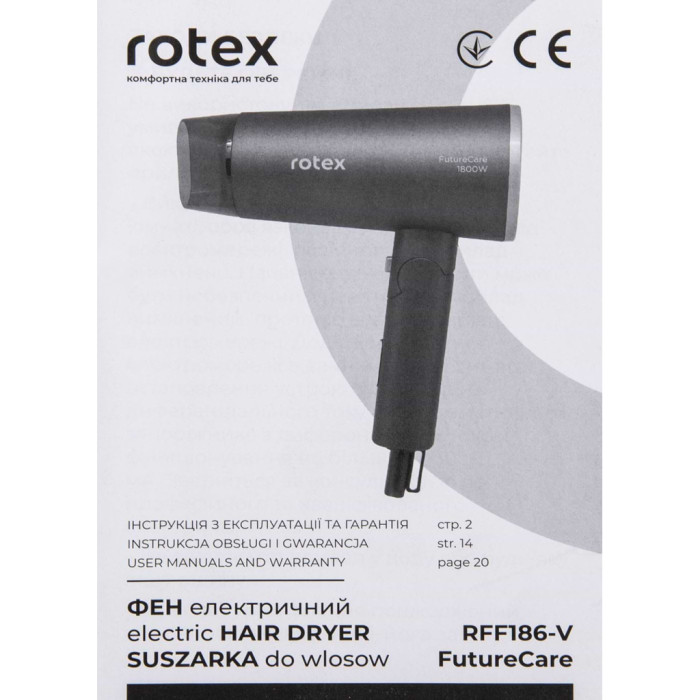 Якщо ви шукаєте продукцію, що поєднує в собі якість і співвідношення "ціна-якість", обирайте ROTX RFF186-V FutureCare. Цей фен неодмінно виправдає ваші очікування та стане найкращим вибором для будь-якої ситуації.