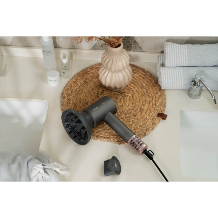 Доступний у стильному поєднанні рожевого та сірого кольорів, фен стане справжньою окрасою вашого інтер'єру та підкреслить ваш вишуканий смак. Його характеристиками часто цікавляться власники кучерявого волосся, адже завдяки функціональним можливостям, він легко справляється з укладанням пишних та неслухняних локонів.