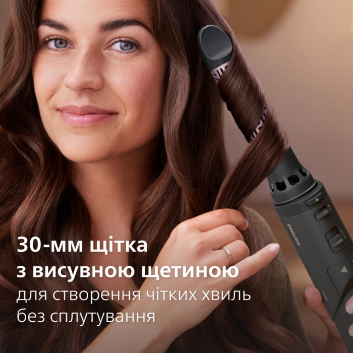 Ця фен-щітка має три насадки для різних укладок — від природних прямих зачісок до чітких хвиль та об’єму біля коренів.