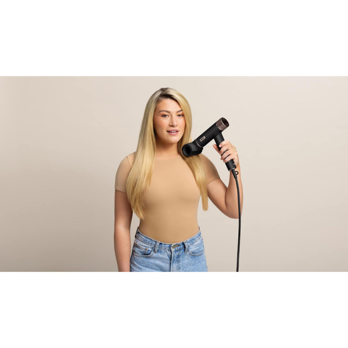 Серед аксесуарів – професійні насадки: Turbo Concentrator для таргетованого сушіння, насадка для завивки, QuickSmooth Brush для швидкого вирівнювання і FrizzFighter, який зменшує пухнастість за допомогою технології Coanda. Це робить фен універсальним інструментом для створення різноманітних укладок.
