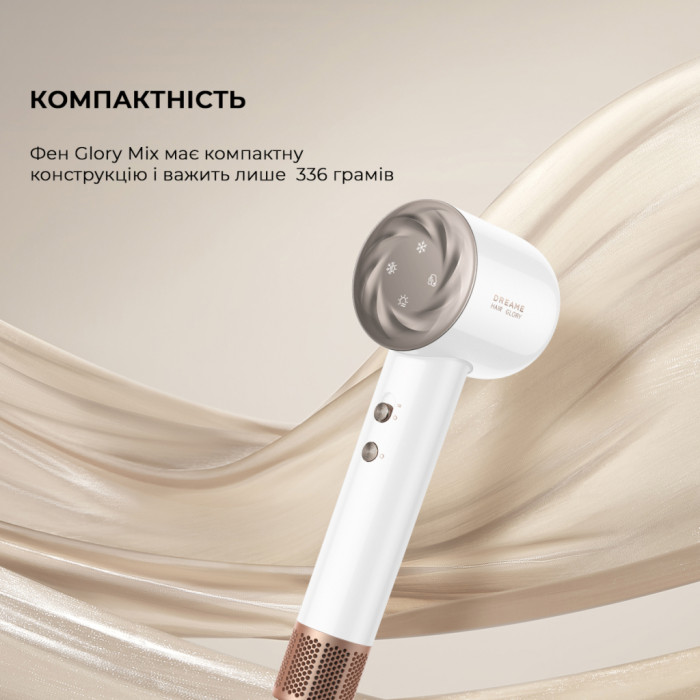 Секрет універсальності цього приладу полягає у наявності насадок. Дифузор є ідеальним для формування об'ємних локонів, а концентратор допомагає створювати акуратні та стильні укладки. Це робить Dreame Glory Mix чудовим вибором для власників кучерявого волосся, надаючи можливість без зусиль створювати різні зачіски.