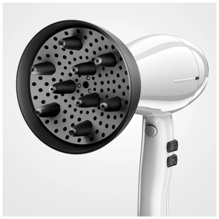 Особливу увагу заслуговує дизайн цього фена: елегантний білий колір в поєднанні з ергономічною ручкою та зручними перемикачами роблять його стильним аксесуаром у вашому арсеналі. Цей фен об'єднує в собі інженерну досконалість та естетичну привабливість.