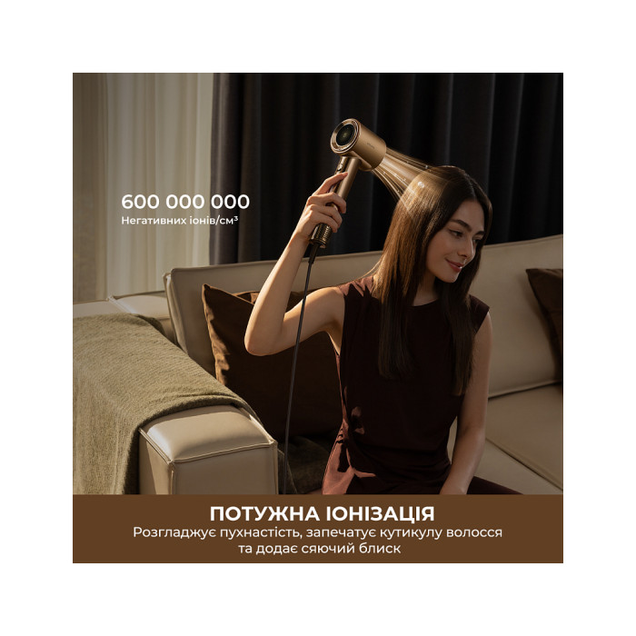 600 мільйонів негативно заряджених іонів роблять волосся м’яким і шовковистим, запобігаючи пухнастості та неохайному вигляду зачіски.
