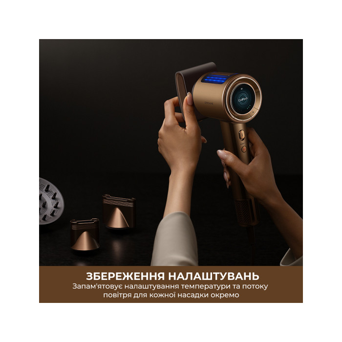 Розумний дисплей відображає актуальні значення режиму ШІ, температури та швидкості повітряного потоку для точного й інтуїтивного керування. Простий інтерфейс дозволяє легко налаштовувати кілька рівнів температури та швидкості, забезпечуючи професійний підхід, як у салоні краси.