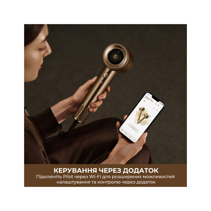Підключення до Wi-Fi дозволяє керувати розширеними налаштуваннями та всіма функціями Pilot безпосередньо у застосунку на смартфоні. Персональні рекомендації формуються спеціально під ваш тип волосся та уподобання в укладанні. Розумні сповіщення інформують про стан пристрою та необхідність обслуговування. ШІ аналізує дані використання й надає рекомендації для покращення догляду за волоссям.