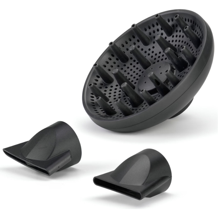 В комплекті до фена додаються дві насадки: концентратор і дифузор. Концентратор дозволяє сконцентрувати потік повітря на конкретній ділянці, що ідеально підходить для точних укладок та випрямлення волосся. Дифузор допомагає створити зачіски з об'ємом і підкреслити природну текстуру та вузликі кучері, що робить його ідеальним інструментом для власників кучерявого волосся.
