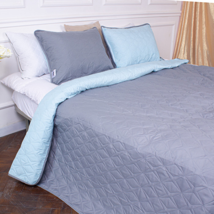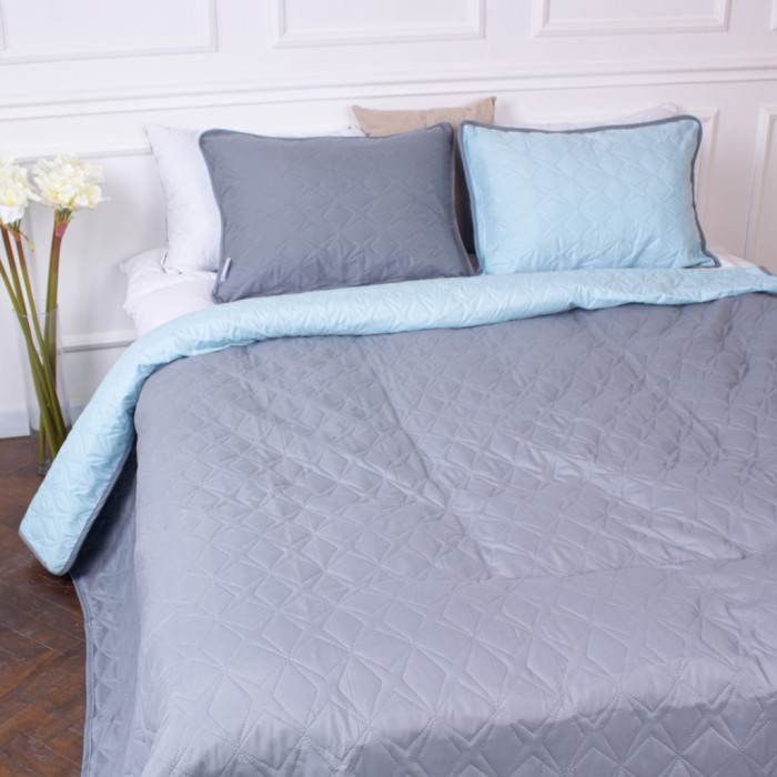 стьобане, Розміри виробу, см - 150 х 210 см, Склад матеріалу - 100% поліестер, наволочки: 50х70 см - 1 шт, двобічні, з наволочками, прати при температурі 40 °С, прасувати при температурі до 110 °С, віджим на низьких обертах або злив води, не відбілювати та не застосовувати засоби хімічного чищення, Колір - сірий