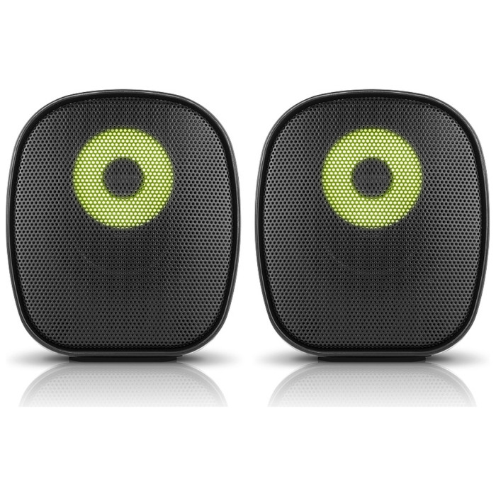 Регулювання гучності зручно розташоване на кабелі, що дозволяє легко і швидко змінити рівень звуку, не відволікаючись від важливих справ. Загальна потужність колонок — 6 Вт, що досить для заповнення звуком кімнати середнього розміру.